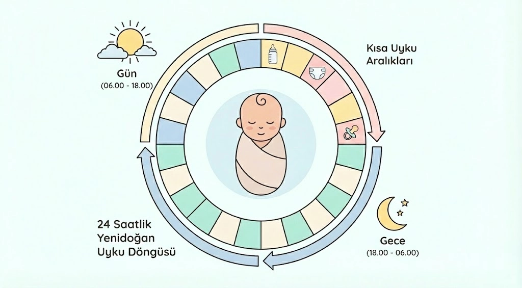 Yenidoğan bebeklerin uyku düzeni, yetişkinlerin alışık olduğu düzenden oldukça farklıdır. Doğduklarında bebeklerin biyolojik saatleri henüz gelişmemiştir ve bu nedenle günün saatlerinden bağımsız, kısa aralıklarla uyur ve uyanırlar. Ortalama bir yenidoğan, 24 saatlik bir günün büyük kısmını uykuda geçirir; ancak bu uyku genellikle 2 ila 4 saatlik periyotlar halinde bölünmüştür. Bu durum hem gece hem de gündüz için geçerlidir. Bebekler bu dönemde yalnızca açlık, alt ıslatma, gaz sancısı ya da fiziksel rahatsızlık gibi ihtiyaçlar doğrultusunda uyanırlar.
