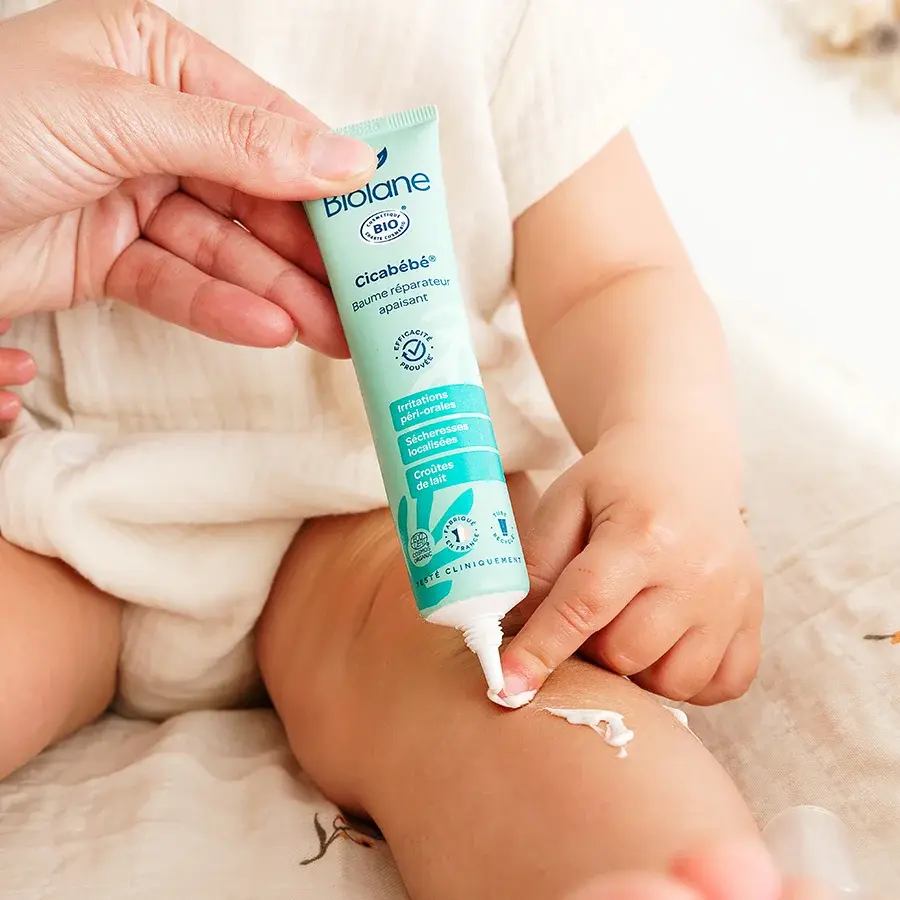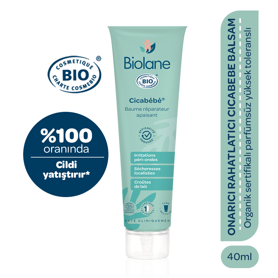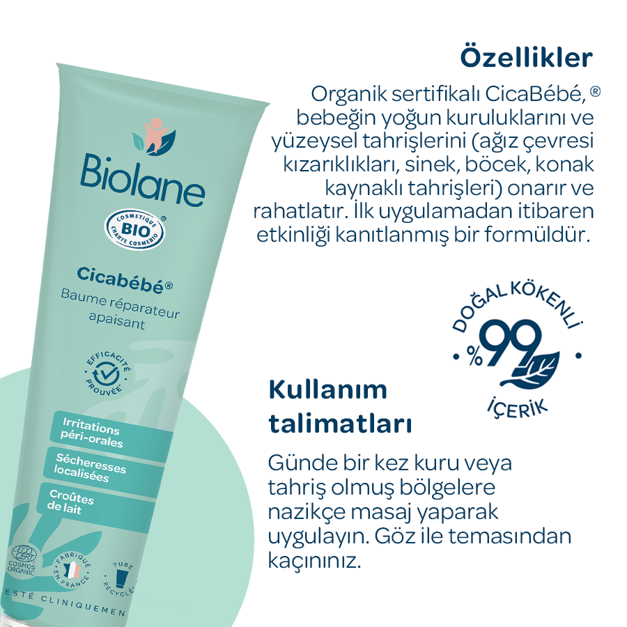 Organik sertifikalı Biolane CicaBébé® bebeklerdeki yoğun kuruluğu ve aşırı tahrişi (perioral dermatit, isilik, sinek böcek ısırıkları, bölgesel tahrişler, konak) onarmaya ve rahatlatmasına yardımcı olur.
