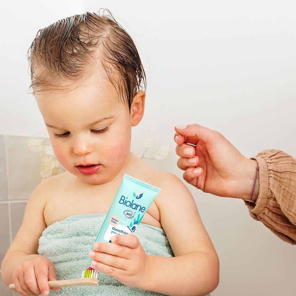 Organik Sertifikalı Biolane 2'si 1 arada Diş Macunu, bebeğinizin süt dişlerini nazikçe temizler ve diş çıkarmadan kaynaklanan damaktaki hassasiyeti yatıştırır.