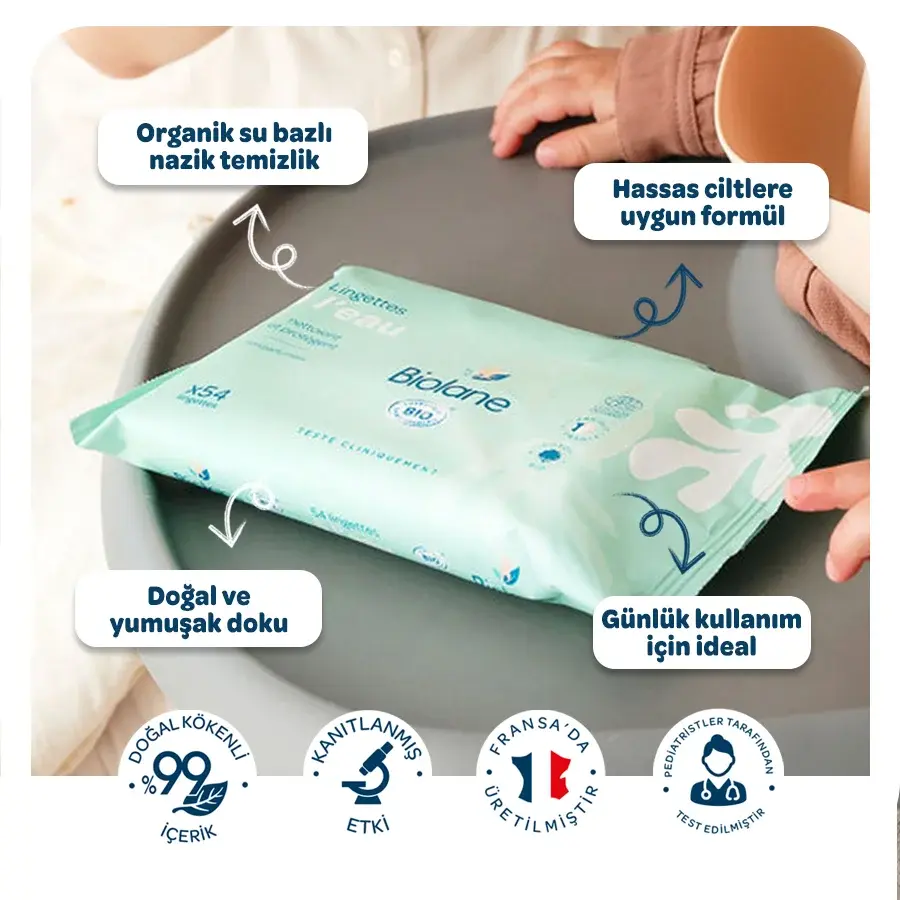 Organik sertifikalı bu Biolane temizleme mendilleri %99 su ile formüle edilmiştir ve bebeklerinizin hassas cildi için idealdir.