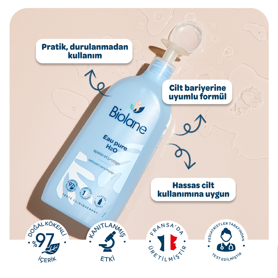 %97 oranında doğal bileşenlerle formüle edilmiş Biolane Eau Pure H2O, bebeğinizin cildini derinlemesine ama nazikçe temizler.