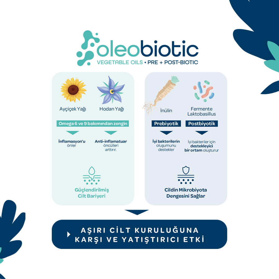 Yüksek konsantrasyona sahip bitkisel yağlar içeren Oleobiyotik Kompleks: yatıştırır, onarır ve korur.